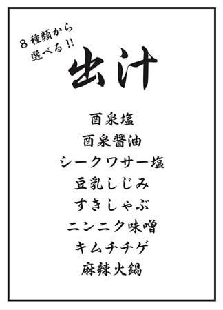 オープン当初は2種類の出汁のみだったが、10月より、酉泉塩・酉泉醤油・シークヮーサー塩・豆乳しじみ・すきしゃぶ・ニンニク味噌・キムチチゲ・麻辣火鍋の8種類にラインナップを拡大。すべて紙鍋を採用し、アク取り不要で最後まで澄んだ味わいを楽しめる。