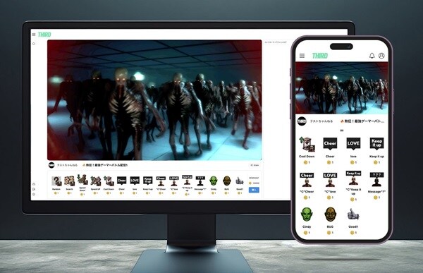 「THIRD」は、視聴者がライブ配信中のゲームに直接参加できる次世代インタラクティブプラットフォーム。配信者がYouTube等を通して専用ゲームを実況配信すると、「THIRD」を通じて視聴者がリアルタイムで介入することができる。