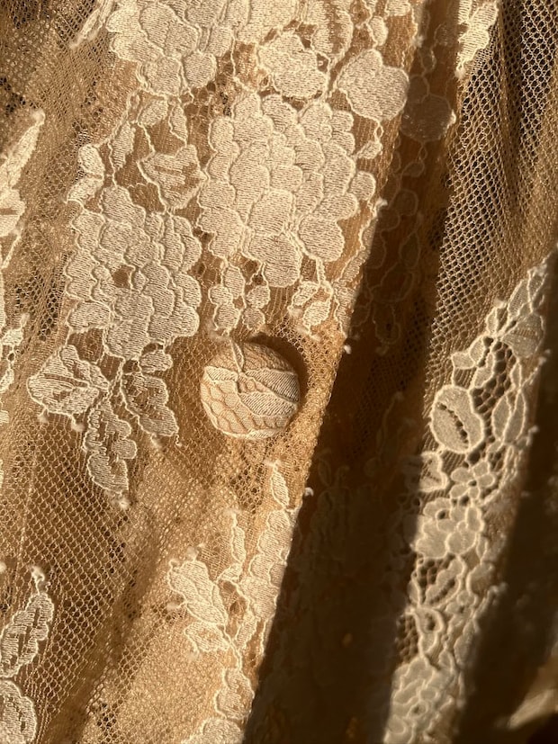 ボタンもボディと同じレースを使った包みボタンを採用。こういったディテールへのこだわりもツボりました!