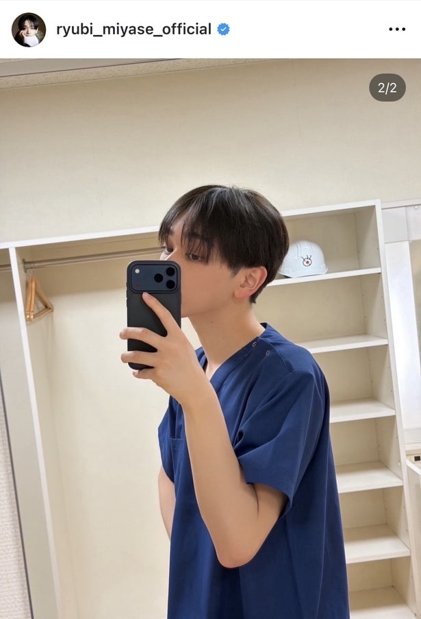 この日、宮世は「今日も、ヤンドク撮影」とピースの絵文字つきのコメントとともに写真を投稿。紺色のスクラブを着用した看護師姿のセルフィーを公開した。