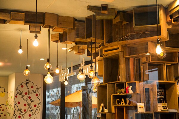 「Adam’s awesome PIE」は、先代が営んでいたりんご農園の木々をモチーフに、立川本店にはりんごの木箱を積み重ねたシンボルツリーや、木をモチーフにしたオブジェが飾られている。