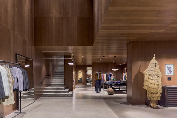 店内は、ダークウッドの壁面とシームレスなコンクリート床で構成された開放感あふれるエントランスホールからはじまり、スペイン産の石灰岩による彫刻的な階段が2フロアを優雅につなぐ。