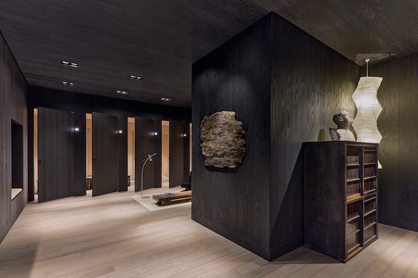 また、焼杉調の質感とガラスのファサードで構成された外観からは、空間を特徴づけるダークウッドの洗練されたパレットを垣間見ることができる。