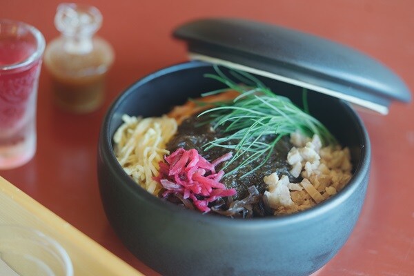 ご飯の上に古宇利島産もずくや旬の食材を彩りよく盛りつけた、朝にふさわしい軽やかな一膳。3つの味を楽しめる食べ方がおすすめだそう。3種類の味わいを通して、古宇利島の自然と文化を味わう特別な食体験を届ける。