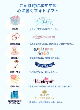 雲の流れや光の入り方によって生まれる、二度と同じにはならない記念日の地球の表情を再現し、「おめでとう」や「ありがとう」「これからもよろしく」など、短い言葉や、想いを込めたメッセージをプラス。言葉と空が合わさることで、記念日はより深い記憶となる。
