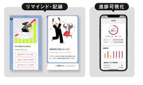 「Oh my teeth」の矯正システムは、リマインドと記録を重視し、毎朝LINEで送られてくる装着リマインドに回答することで、前日の装着時間を自動でトラックできる。また、進捗可視化もでき、装着レポート画面で「ゴールまであと何日か」をいつでも確認できることで、モチベーション維持につながる。