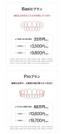また、シンプルな料金体系も魅力。矯正プランは2つのみで、おもに笑ったときに見える前歯に特化した「部分矯正(Basicプラン)」と広範囲矯正の「Proプラン」がある。矯正プランは、ユーザーのお口の状態や希望に応じて、提携クリニックの歯科医師の診断のもと案内。矯正中の進捗確認は主にLINEでサポートしており、日常生活に取り入れやすい。
