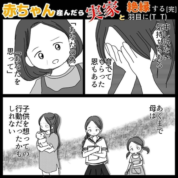 実母の行動も、フォロワーさんのことを思ってのものだったはずです。しかし母親の愛情と子どもの気持ちが折り合わないことはあるもの。実母も家族ですが、フォロワーさんには夫と子どもという新しい家族もいます。「家族」の中で何を大事にするのか、今一度考えさせられる作品でした。