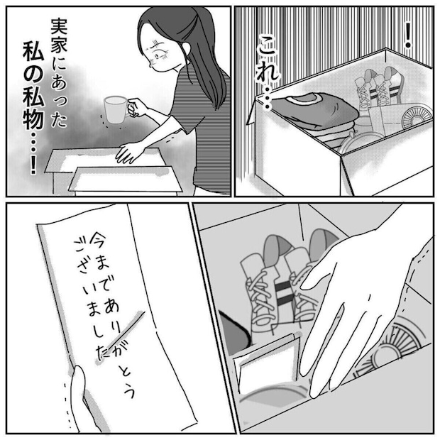 そしてある日届いた宅配便。開けると「今までありがとうございました」と書かれた手紙とともに、実家に置いたままにしていた荷物が…。結局、フォロワーさんと実母はわかりあえませんでした。ずっと育ててくれた「お母さん」の連絡先を、涙ながらに削除したとのことです。