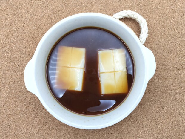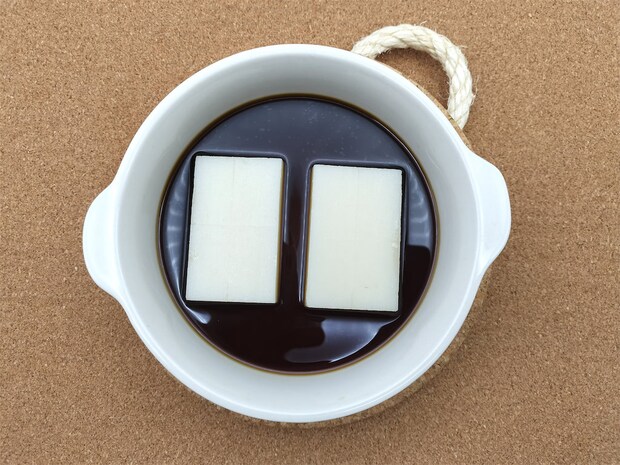 2. 砂糖をよく溶かしてから切り餅を入れ、ラップをかけずに500Wの電子レンジで2分30秒加熱します。触ってみて餅が柔らかくなっていなければ、様子を見ながら加熱します。