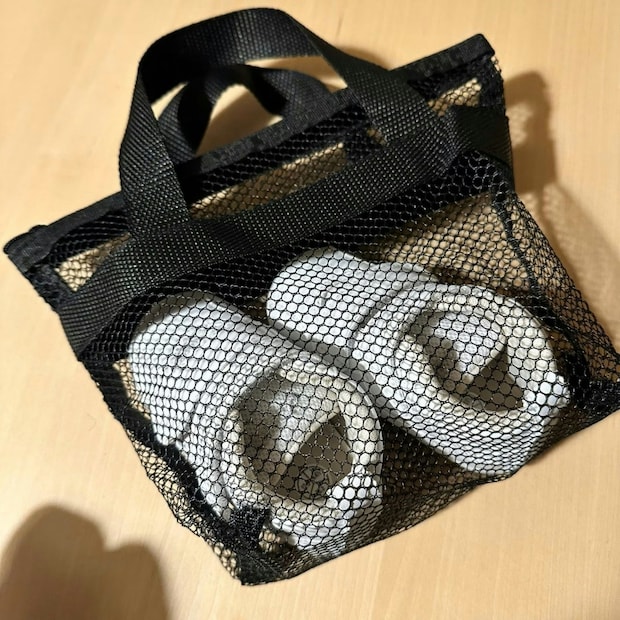 シューズクリップは微妙だと感じていたところに、メッシュのポーチを見つけたというこもさん。メッシュなので通気性は抜群ですし、子どもが勝手に靴を脱いでなくしてしまう心配もいらないですよね。何よりもこれは100円ショップのセリアで見つけた商品とのこと。『スパバッグ メッシュタイプ』という商品のようです。100円であれば汚れても寛大でいられますし、お試しで買ってみたくなりますよね。