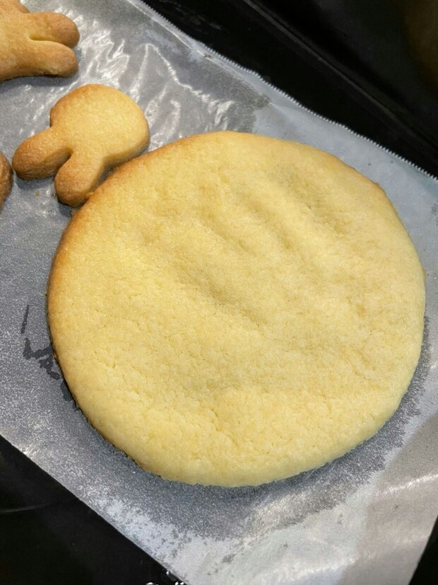 パッと見ただけでは丸い大きなクッキーですが、なんと1歳の娘さんの手形がクッキーに押してあるとのこと。目を凝らして見てみると、確かに手形が見えますよね。この投稿には「見える…見えます…!」というリプライや「そこにイチゴジャムを塗ったらわかりやすかったです」というアドバイスも。