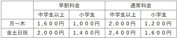 早割料金は、月~木が中学生以上1,600円/小学生1,000円、金土日祝が中学生以上2,000円/小学生1,400円。