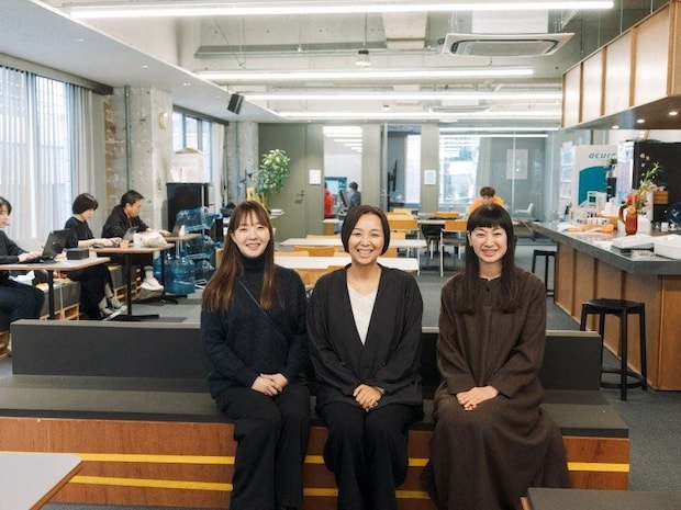 社長の小泉絢子さんの両隣は人事総務企画室ケアチームの加納めぐみさん、木村桃子さん。ケアチームは、お客様の受付も担当。オフィスに流れる心地いい雰囲気は、入口で迎える社員の笑顔から始まっています