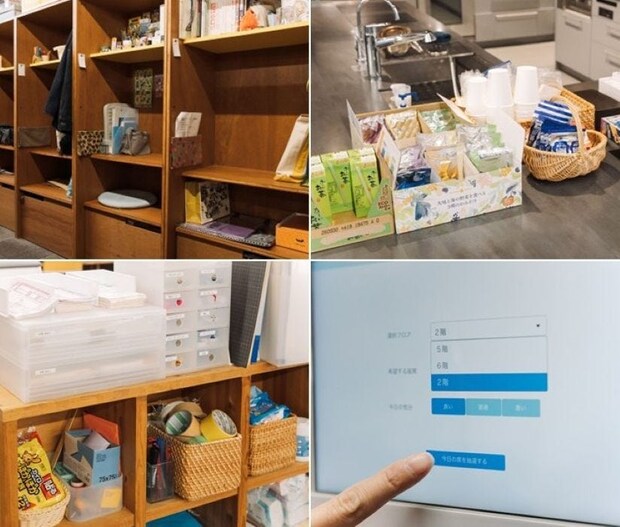 フリーアドレスになってから、オフィスの備品はひとつの棚に集約。あると便利なアイテムを、ケアチームがこまめに管理