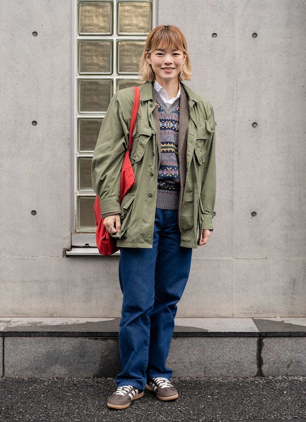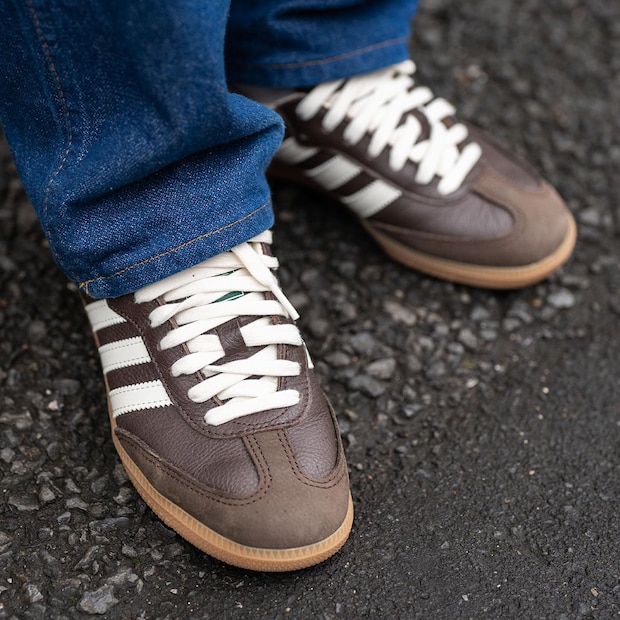 足元は『アディダス』のブラウンスニーカーをオン! デニムとの相性抜群で、こなれ感もばっちり。