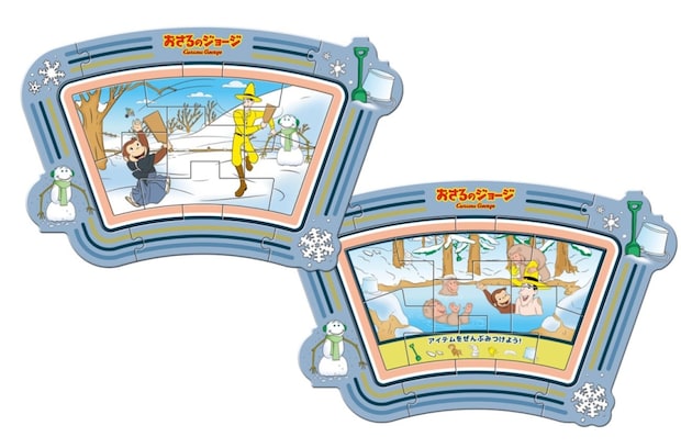 「おさるのジョージ」のおもちゃ第2弾は、表面がパズル、裏面がゲームになった仕様で、2通りの遊びが楽しめる。論理性や図形・空間認識力を高めることが期待できるという。
