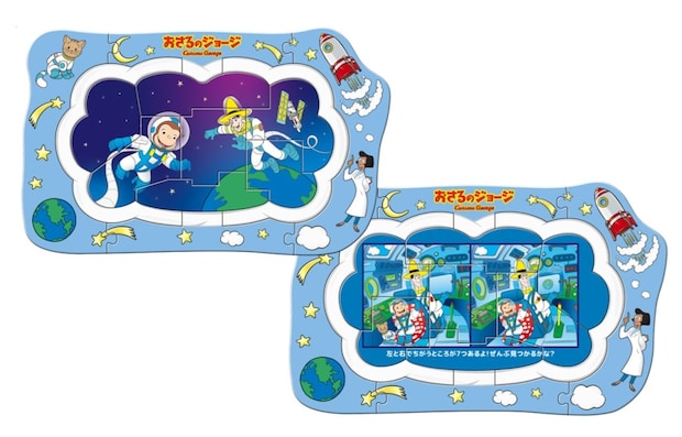 表面は宇宙服姿のジョージと黄色い帽子のおじさんのパズル。裏面は間違い探し。