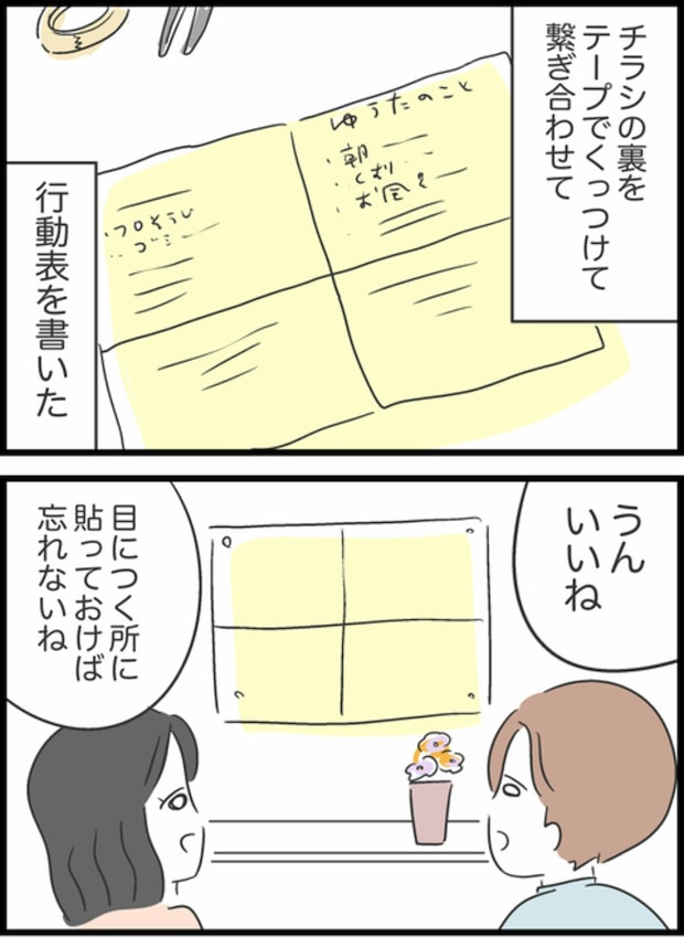 夫婦再構築のために作戦を立てることにしたようことしょうたは、まず行動表を書くことに。それからは夫婦の会話も増えて…。