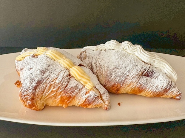 長さ約16cmもある大きなサクサクのクロワッサンに、キイロワッサンにはカスタード、シロワッサンには生クリームがたっぷりと入っています。