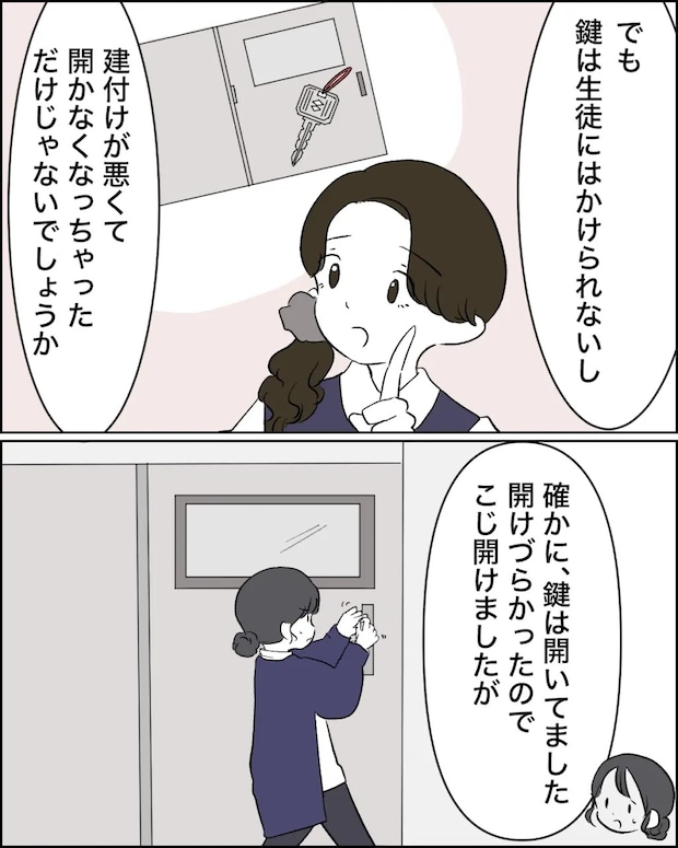 「でも、鍵は生徒にはかけられないし、建付けが悪くて開かなくなっちゃっただけじゃないでしょうか」と風見さんが言うと、「確かに、鍵は開いていました。開けづらかったのでこじ開けましたが」と水原先生が答えました。