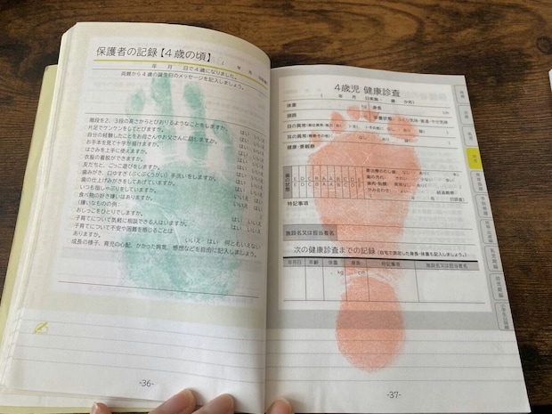 息子さんが4歳になり、手形・足形を母子手帳に押すアイデアにたどりついたchiipiiさん。母子手帳というのは目からうろこですよね。多くの方が持っていて、1人1冊交付される母子手帳を使うとは、シンプルかつ合理的な感じがします。いつか手がはみだしそうですが、それもまた思い出かも。