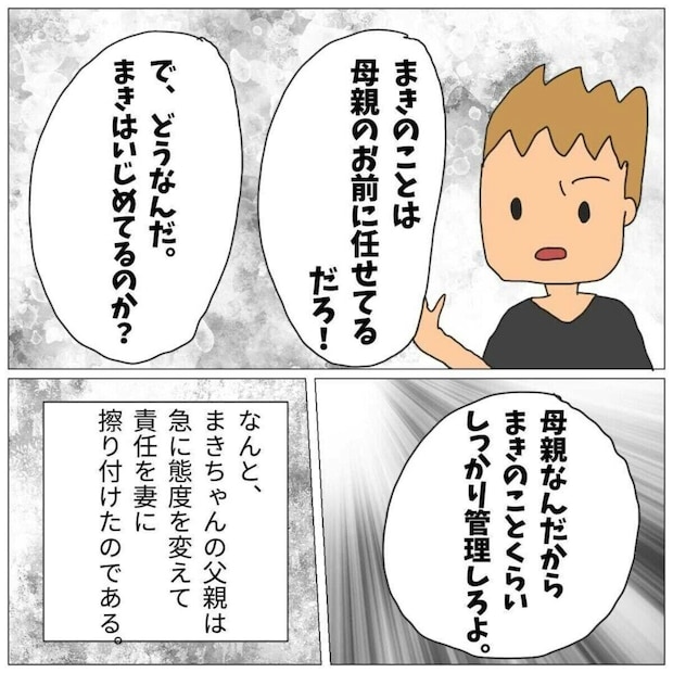裁判の話をした途端、お金のことを気にしだしたいじめっ子の父。さらに、娘のしたことの責任を、すべて妻へなすりつけようとする始末です。これには、主人公夫婦もあ然としてしまいます。