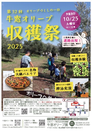 第32回牛窓オリーブ収穫祭2025「オリーブづくしの一日」は、10月25日(土)に開催。当日は、オリーブの収穫体験(無料。実は持ち帰り不可)、搾油実演と搾りたてオイルの試飲(無料)、こだわりのオリーブオイルを使ったオリーブ料理(有料)、工作教室(オイルモーション作り)、オリーブコンサート、オリーブの苗木育て方講座、瀬戸内市移動遊び場プレーカー、子ども広場(屋外迷路・射的など縁日)、オリーブの商品販売、地元の特産品やクラフト等の出店などさまざまな催しが予定されている。また、大鍋でのパエリアの提供は、牛窓オリーブ収穫祭の目玉イベント。整理券(チケット)順420名分限定の無料試食と1杯500円で84食限定がある。