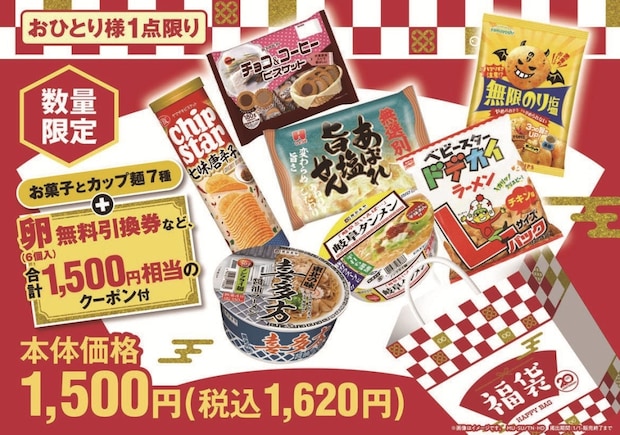 福袋には、菓子5品と即席麺2品に加え、1月5日以降に利用できる総額1,500円相当のクーポンチラシを封入している。