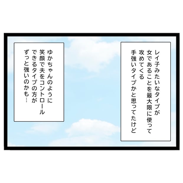 レイ子みたいなタイプが女であることを最大限に使って攻めてくる手強いタイプかと思ってたけど、ゆかちゃんのように、笑顔で夫をコントロールできるタイプの方がずっと強いのかも・・とゆかちゃんを見てしみじみ感じたのでした。