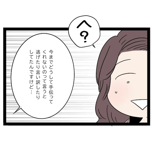 「へ?」そう言われてもいまいちピンとこない私に、「今まで、『どうして手伝ってくれないの?』って言うと、逃げたり言い訳したりしてたんですけど・・」