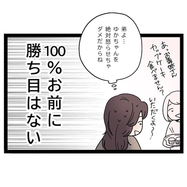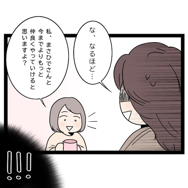 仕事一筋の雅美さんは、弟まさひでさんの妻で義妹のゆかさんに「まさひでさんが浮気してるかも」とまさかの相談を受け、すぐにまさひでさんを問い詰めると、同じ職場で働く派遣社員のレイ子さんという女性と仕事の相談に乗っているも特別な感情はなく上司と部下の関係だと聞くも、その後、2人で食事に行く仲だと聞きまさひでさんの自覚のなさすぎる行動に呆れかえった雅美さんは「世の中には幸せそうな家庭を壊すのが好きな女がいる」とレイ子さんの本性を突き付けますがまさひでさんは半信半疑。タイミング良くかかってきたレイ子さんからの電話に出た雅美さんは「泣き顔の自撮り見て爆笑。友達の彼氏にコナかけてみんないなくなっちゃった感じ?」とレイ子さんを徹底的に煽り、「は?黙れやばばぁ」とレイ子さんの本性が露呈。豹変したレイ子さんの姿に青ざめるまさひでさんに「これで変な相談は来ないと思うよ」と笑顔で言う雅美さん。その後、ゆかさんに、レイ子さんが派遣契約を更新せず次の職場へ行くことになったと聞き一安心した雅美さん。すると、「レイ子さんとのトーク画像のおかげで対策できる」と言われ不思議な気持ちに。そこへまさひでさんが拓人くんのオムツを替えると言うと、「本当にいいパパで私も拓人も幸せ」と歯が浮くような言葉を言うゆかさんに照れる雅美さん。すると、「今見たでしょ?」とゆかさんの言葉の意味がわかりませんでした。