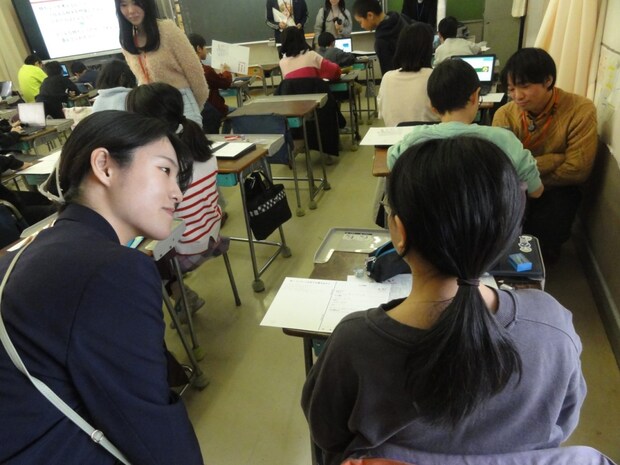 デザインについての考え方を一通り説明されたあと、子どもたちは各々のイメージやテーマを考え、これを明星社員が見回ってアドバイスするなど、子どもたちと和やかな交流が行われた。黙々と箇条書きで思いついたアイデアを書き出していく生徒や、イメージをふくらませるためにクラスで配布されたタブレットを利用してインターネットで調べ物をする生徒など、様々な形で課題にアプローチする姿が見られた。