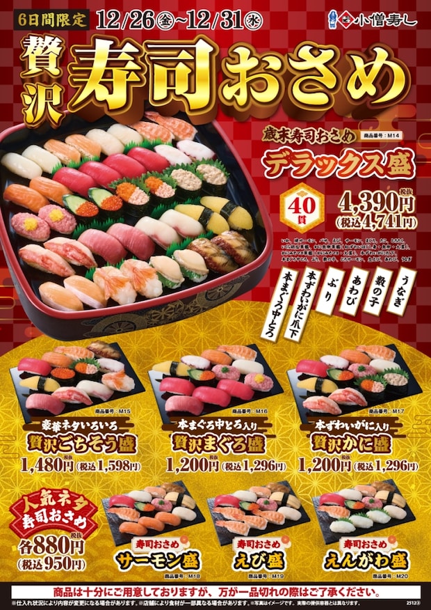 持ち帰りすし店「小僧寿し」は、12月26日から歳末感謝祭「贅沢寿司おさめ」を開始する。実施期間は12月31日(水)まで。