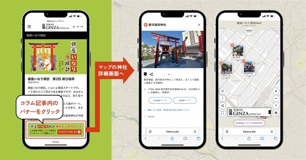 今回公開された「銀座いなり探訪MAP」は、「銀座いなり探訪」の各回で紹介された神社を「PointMap+」でまとめたデジタルマップ。「GINZA OFFICIAL」サイト内の「銀座いなり探訪」コラムにも、「銀座いなり探訪MAP」へのリンクが掲載されている。