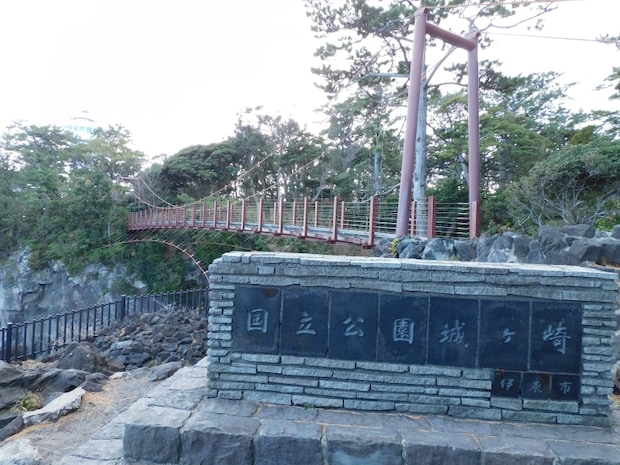 伊豆半島を代表する景勝地で、約9㎞に渡って断崖絶壁の海岸線が続いています。中でも海面からの高さ23m、長さ48mの「門脇つり橋」は多くの観光客が訪れる伊豆の大人気の観光地です。