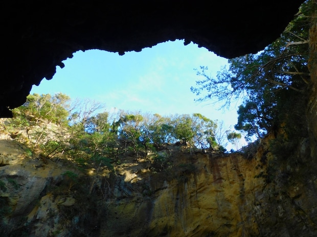 波の浸食作用によってできた洞窟で、天井の一部が崩れ落ちて直径50mほどの天窓が空いている独特の洞窟です。