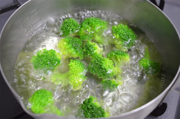 3. ブロッコリーは、茎部分を落として小房に分ける。鍋に湯(分量外)を沸かして30秒ほど茹でて、水気を切る。