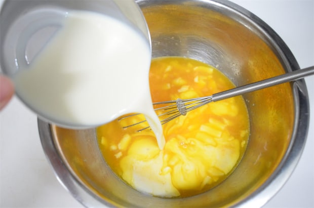 5. ボウルに卵をときほぐし、[A]を加えて混ぜる。そこに4を加えて全体に混ぜたら、1のバットに流し入れる。200℃に予熱したオーブンで25分焼く。