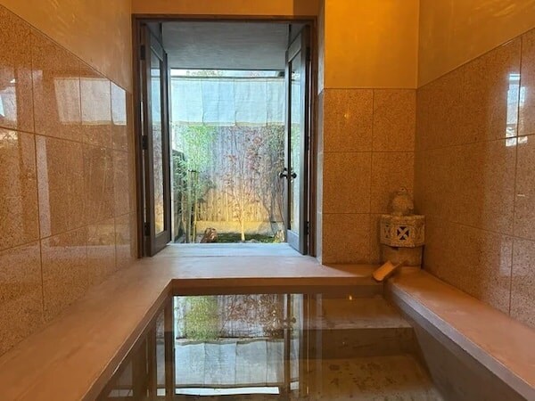 半露天風呂・サウナ・蔵BAR・日本庭園を備え、玄関アプローチに醤油醸造所時代の重石をそのまま残しているのが特徴だ。
