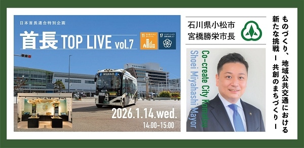 「地方創生を通じて、日本の未来社会を創造する首長連合(通称:日本首長連合)」は、2026年1月14日(水)にオンラインにて、石川県小松市の宮橋市長が登壇する「首長TOP LIVE vol.7」を開催する。現在、申込フォームにて参加者を受け付けている。