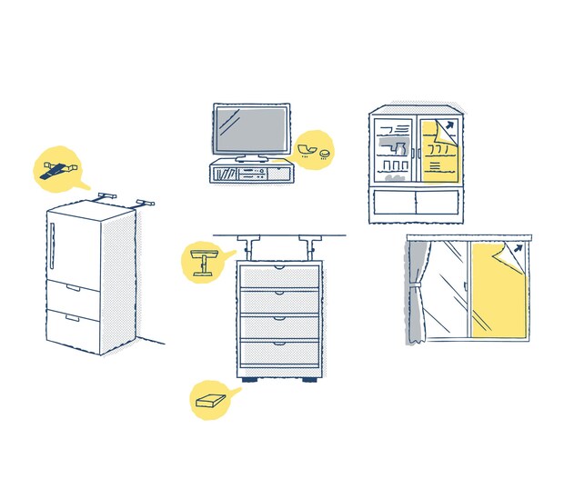 地震に備え、タンスなどの家具をL字金具や突っ張り棒で固定しましょう。前開きの食器棚は、地震の揺れで扉が開いて食器が散乱しないように耐震ロックを取り付ける方法があります。