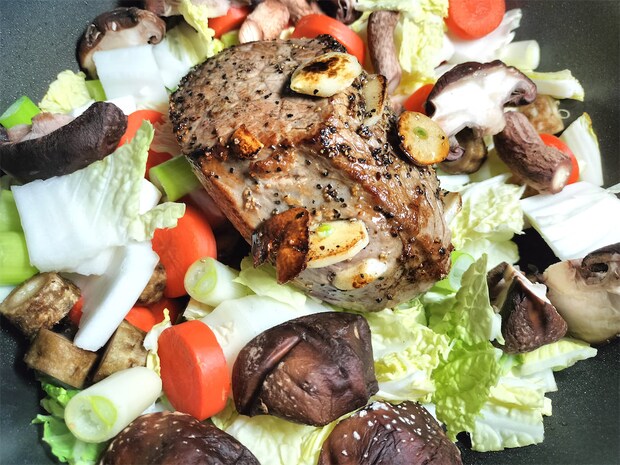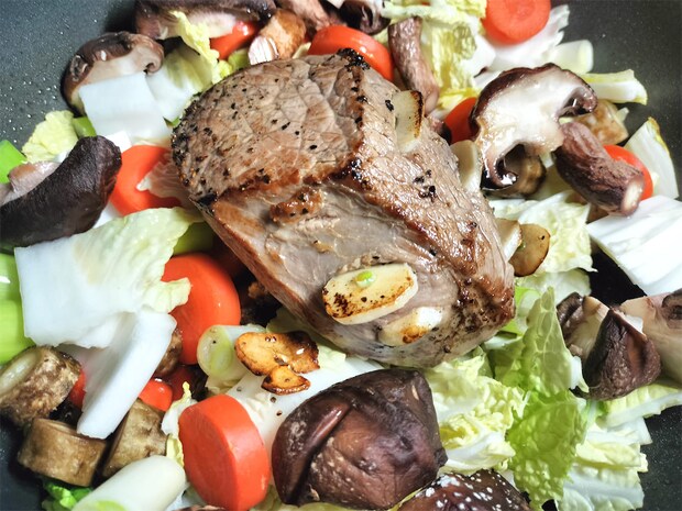 普段作るローストビーフとは違うレシピでしたので、出来上がりが心配でしたが、火の入り方も丁度いい仕上がりになってほっとしました。蒸し焼きにした野菜をソース代わりにするという食べ方ですが、割り下の甘さが不思議と合っていて、よく知っているローストビーフとはまた違ったおいしさで、挟み込んだにんにくは思ったほど強くありませんでしたが、香りはしっかりと広がっていました。