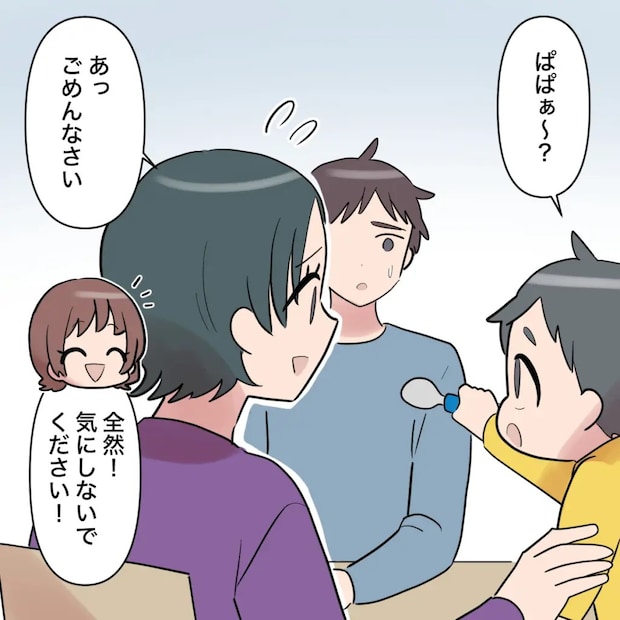 ソウくんがトモヤを「ぱぱ」と呼ぶのだって、まったく気にしません。「あっ、ごめんなさい」と気まずそうにするトモヤとキョウカさんに向かって、私は「全然!気にしないでください」と笑顔で答えました。
