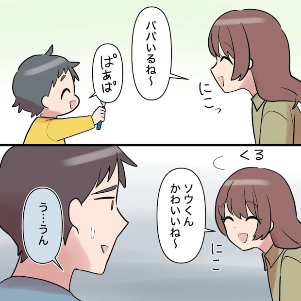 「パパいるね~」と声をかけると、ソウくんはにこっと笑って「ぱぁぱ」と返してくれました。私はそのままトモヤに視線を向け、「ソウくん、かわいいね~」と満面の笑みで言います。ソウくんの「ぱぁぱ」を受け入れてずっと笑顔を崩さない私が不気味なのか、トモヤは引きつった顔で「う・・・うん」と小さく頷きました。