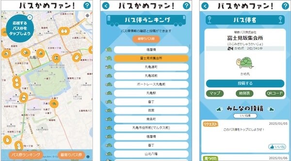 Webアプリ「バスかめファン!」は、バスを楽しみ(fun)、丸亀のファン(fan)の輪を広げるための企画。丸亀市内のバス停についての要望や周辺スポットのシェアしたい情報を投稿したり「いいね」することで、各バス停に住むキャラクター「かめ丸」をみんなで育てる、ゲーム要素を持った実証実験中のWebアプリだ。