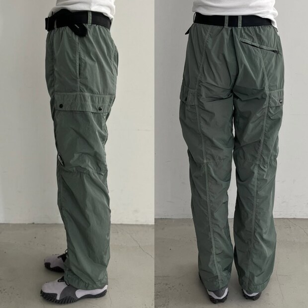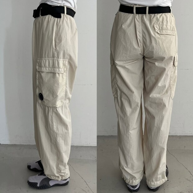 個人的に【C.P. カンパニー】といえばカーゴパンツ! と思ってセレクトしたのがこちら。リサイクルナイロン製なんですが、ガーメントダイを施しているので、生地の風合いがとってもユニークなんです。角度や光のあたり具合によって表情が変わるというか、ほかではない生地感は女性もグッとくるはず。