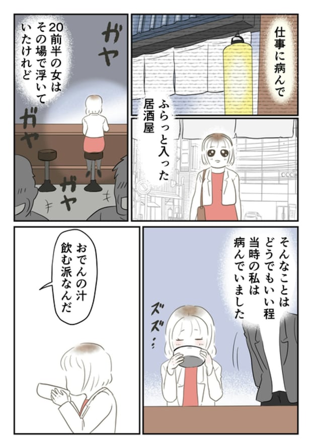 当時、仕事に悩んでいた尾持さんは、ふらっと居酒屋に立ち寄ります。晴れない心でおでんを食べ、汁をすすっていました。すると、ひとりの男性が声をかけてきます。