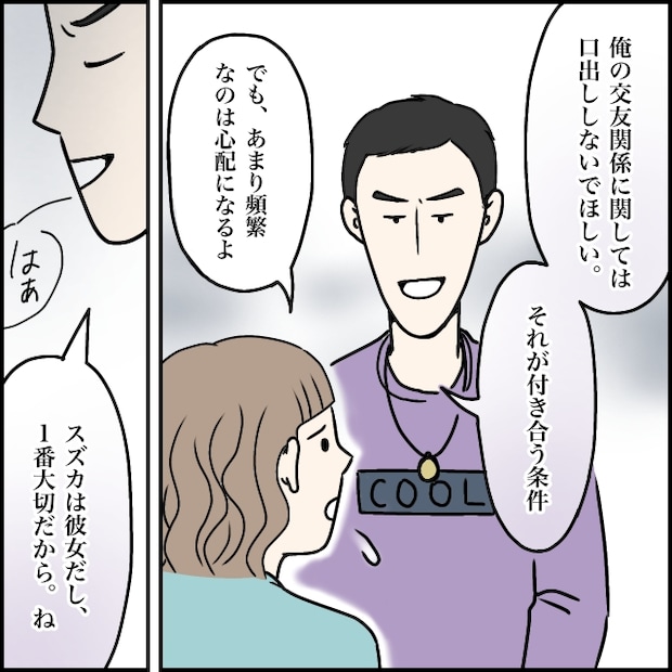 「俺の交友関係に関しては口出ししないでほしい、それが付き合う条件」そう告げるタカシに私は戸惑いながら「でも、あまり頻繁だと心配になるよ」と本音を伝えました。するとタカシは小さくため息をつき、「スズカは彼女だし、1番大切だから、ね」と諭すように言いました。