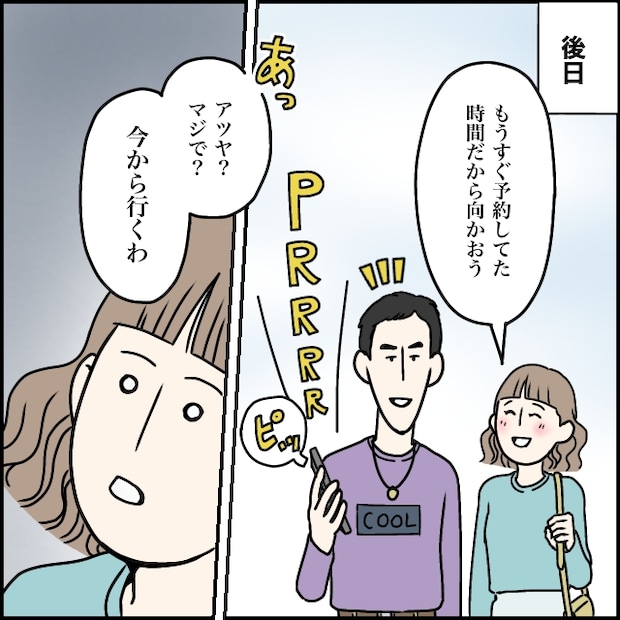 それからしばらくは、喧嘩もなく穏やかな日々が続いていました。そして、今日はタカシとずっと楽しみにしていたカフェデートの日。「もうすぐ予約してた時間だから向かおう」そう言いながら歩いていると、タカシのスマホが鳴ります。タカシは迷いなく電話に出ると、「あっアツヤ?マジで?今から行くわ」と即答。その瞬間、嫌な予感が胸をよぎりました。